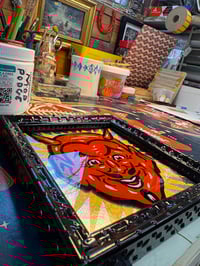 “HELL YEAH!” - enamel on glass (inverse). background is imitation silver leaf and FerreroRocher chocolate wrappers (cleaned and cut). Framed in thrifted frame blinged out with glue dots and fresh coat of spray paint. hangers, wire and screws pillaged from other thrifted frames. GO GREEN ART!!! 6”w x 6.75”t. Ready to hang on your wall to support your bad decisions!