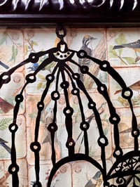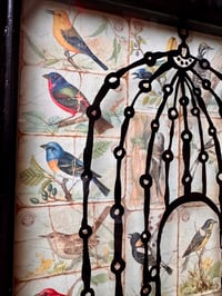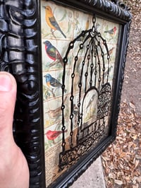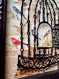 “No Gods, No Kings, Means No Clipped Wings.” - enamel on glass (inverse), background, collaged Arm & Hammer collector cards of Useful Birds of America circa 1915 and random newspaper scraps on panel. Framed in a reconditioned frame, satin black finish. 10.5”w x 12.5”t. Ready to hang.