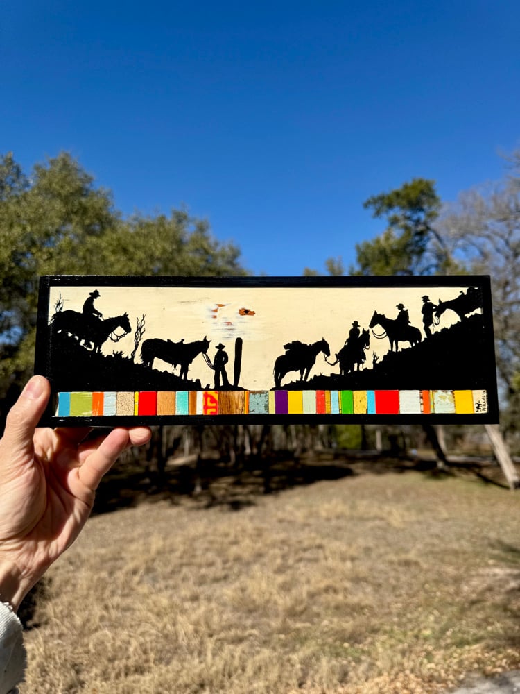 “Prospector’s Gulch” - acrylic on salvaged wood assemblage. Framed. Gloss finish. 14.5”w x 5”t.