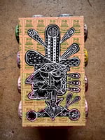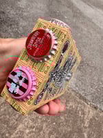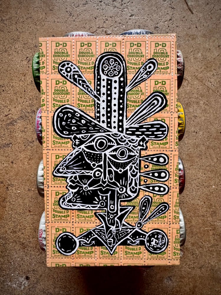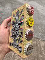 “They Called Him Sodey Pop” - acrylic on collaged vintage “D-D Double Discount Stamp” sheet, faux silver leaf, and framed with vintage pop bottle caps on construction debris. Gloss varnish on image. 3.75”w x 6”t. Ready to hang.